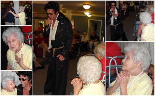 I just ran across this great article about a couple in Arizona helping Alzheimer’s patients through their Love Music Revival. It’s funny, because some of our best times at Outlook Manor were on the nights when they had musical entertainment. One evening in particular stands out – the “feature act” was Elvis, and the residents loved it! To many of those folks, lacking a sense of time, it may as well have been 1956 and they may as well have been in the audience of that oh-so-famous Ed Sullivan Show. The fact that this was an impersonator was lost on them, and what a blessing that was!