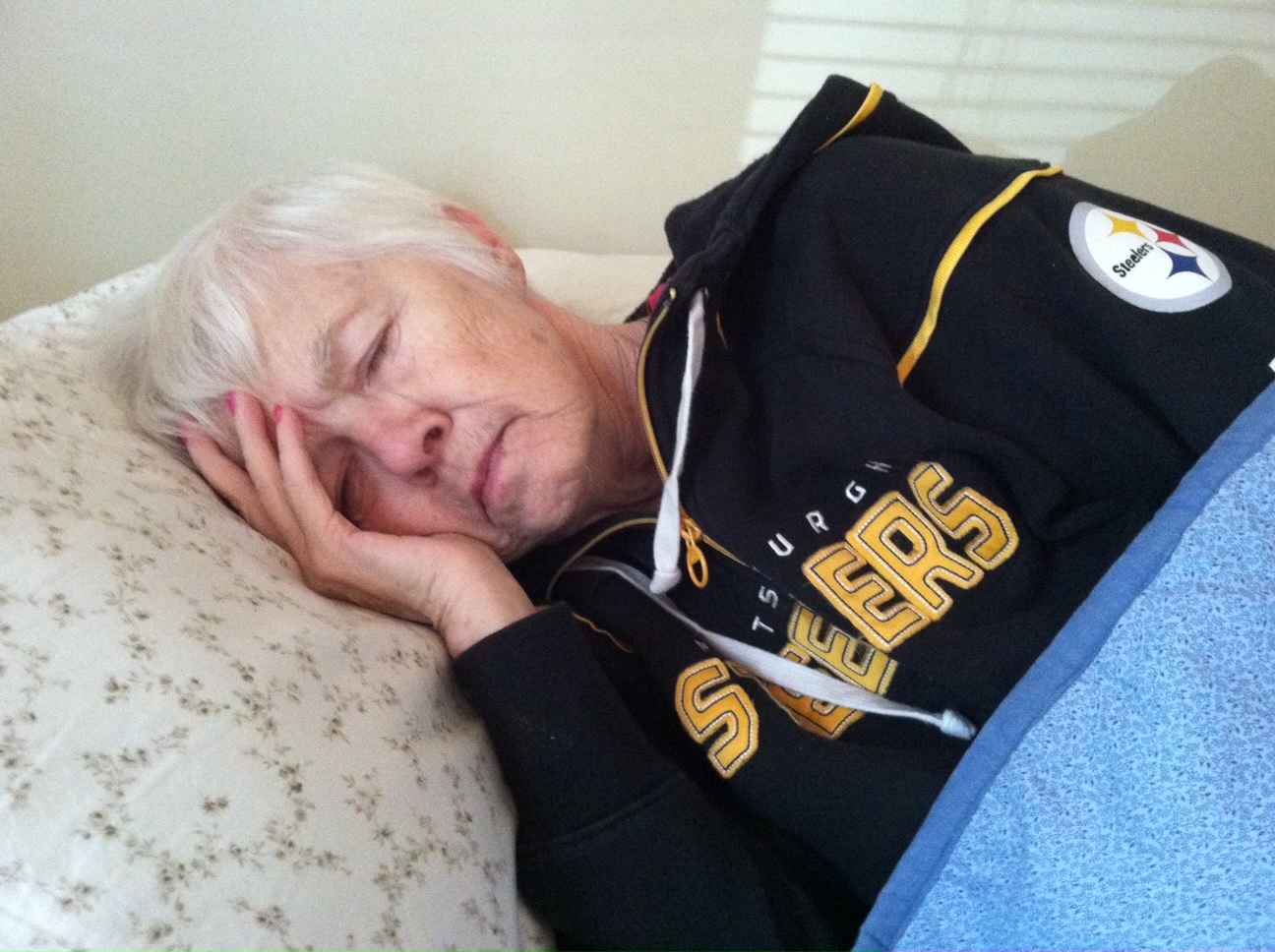 After her meds, she finally did lay down on her bed. I held her hand and rubbed her leg, and she fell into a restful sleep. All in all, not a great day, but as always, there were some lovely moments.