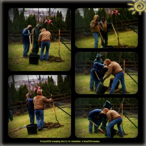 A wonderful friend had a weeping cherry tree planted in my yard today in memory of Mom. It was her favorite tree; her co-workers had one planted in her yard as a retirement gift and it was absolutely beautiful. I can’t wait to see the new tree bloom… what a perfect way to remember her year after year… Thank you so much, Courtney.