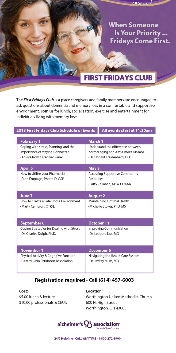 Here is a fantastic educational opportunity for Central Ohioans – The Central Ohio Alzheimer’s Association’s Monthly “First Fridays Club” begins in February.