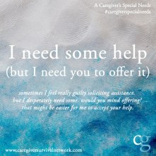 While trying to balance everything they are dealing with emotionally, logistically, physically, and otherwise, caregivers all too often forget to care for themselves. Most have a very difficult time asking for help (and even accepting help when offered), but that needs to change. There are free, easily accessible tools, such as the Alzheimer’s Association Care Team Calendar and CareZone that can make this easier, so check them out! (And watch for my Caregivers post on Monday to learn more about CareZone.)