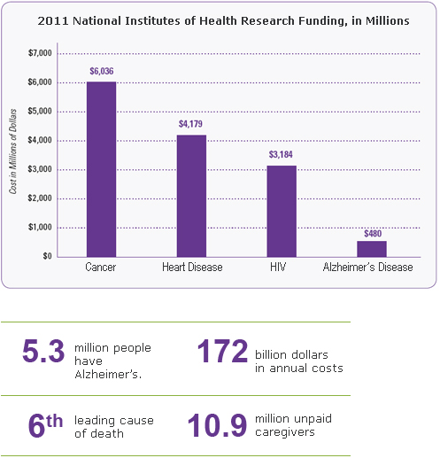 The National Institutes of Health spends over $6 billion a year on cancer research, over $4 billion on heart disease research and over $3 billion on HIV/AIDS research. But it spends only $480 million on Alzheimer’s research. While passage of the recent omnibus bill will add another $100 million, we are still well below where we need to be.