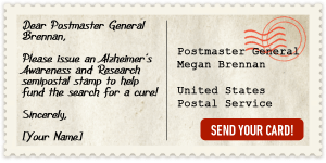 Our friends at UsAgainstAlzheimer’s, along with their partners and allies, are also calling for an Alzheimer’s Awareness and Research stamp. To that end, they have created a simple way for you to ask Postmaster General Megan Brennan to issue a semipostal that will help fund the search for a cure. Click here to add your name; it takes less than a minute and will make a big impact!